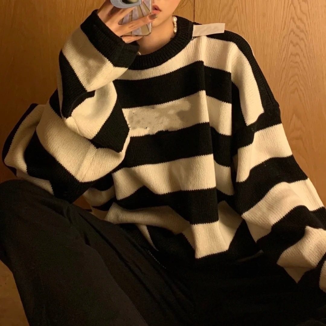 shen仙颜值可柔可飒 联名设计款 露肩显瘦套条黑白头纹os阔版毛衣热门设计联盟服务商