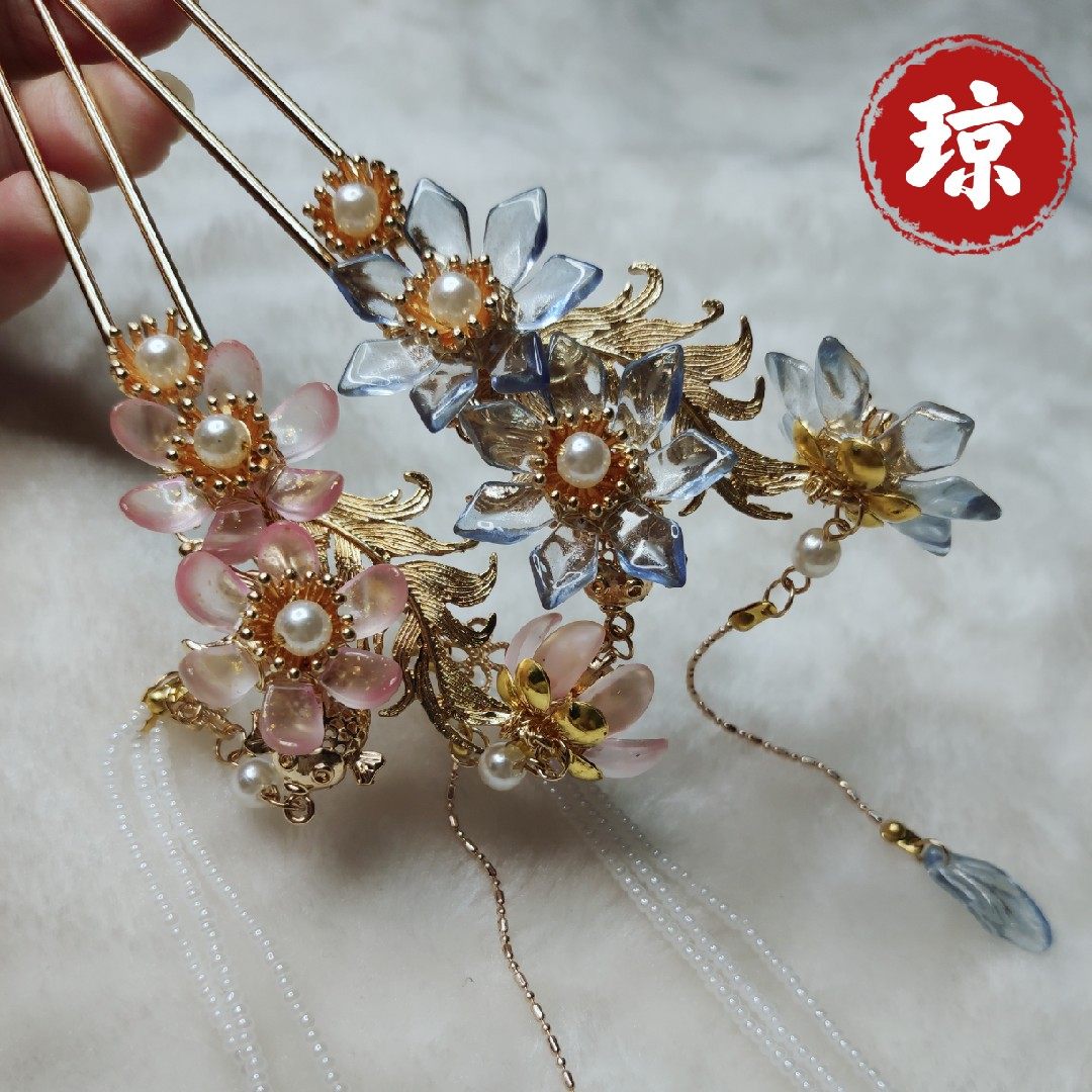 琼华记原创设计汉服古风发饰长流苏昙花桃花珍珠凤尾发钗热门设计联盟服务商